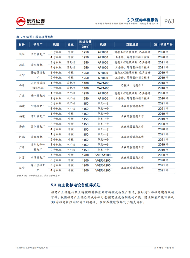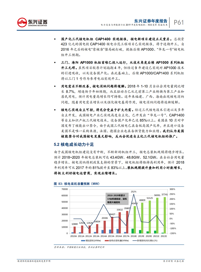 在核電領(lǐng)域,總投資423億元的國電投CAP1400核電示范工程項目已實現(xiàn)核準(zhǔn),將于近期開工。2019年自主三代核電技術(shù)有望取得突破,中核漳州1、2號和廣核惠州1、2號共4臺“華龍一號”機組核準(zhǔn)預(yù)期不斷提升。