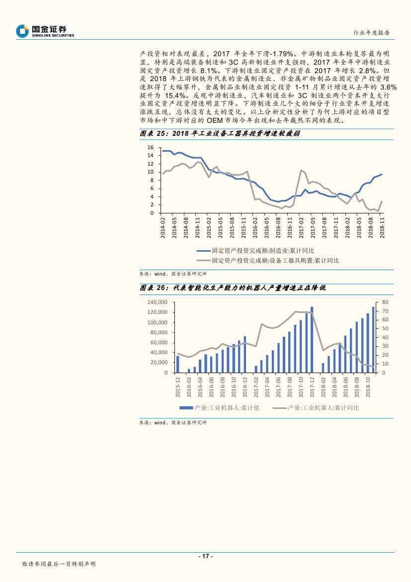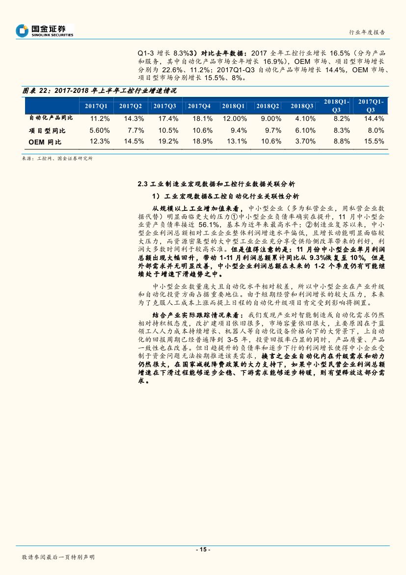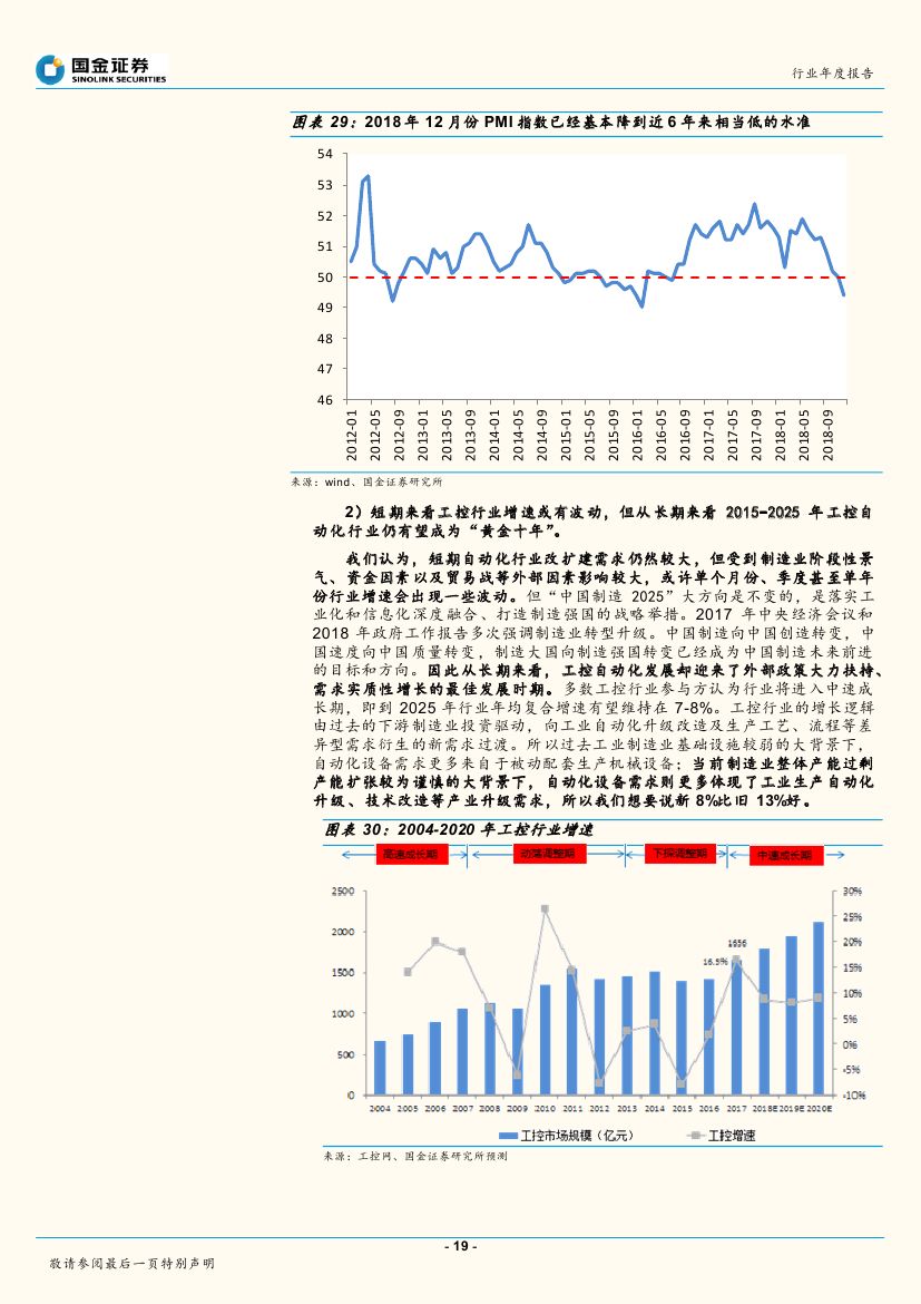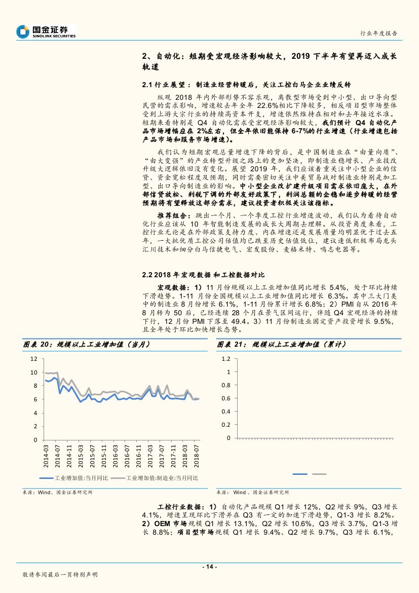 自動(dòng)化:短期受宏觀(guān)經(jīng)濟(jì)影響較大,2019 下半年有望再邁入成長(zhǎng)軌道。截止 2018Q3 行業(yè)增長(zhǎng) 8.2%并不算太差。短期:工業(yè)制造業(yè)應(yīng)當(dāng)仍在向下尋 底過(guò)程中,近來(lái)板塊估值的下殺已反映對(duì)于 2019 年 1 季度的悲觀(guān)預(yù)期;中 期:中小型企業(yè)改擴(kuò)建項(xiàng)目需求依舊龐大,2019 年下半年在外部信貸放 松、利稅下調(diào)的外部友好政策下,利潤(rùn)總額的企穩(wěn)和逐步轉(zhuǎn)暖的經(jīng)營(yíng)預(yù)期將 有望釋放這類(lèi)需求。長(zhǎng)期:工控行業(yè)已經(jīng)步入了外部政策大力扶持、需求實(shí)質(zhì)性增長(zhǎng)的中速發(fā)展期,需要以戰(zhàn)略眼光看待自動(dòng)化升級(jí)“黃金十年”。