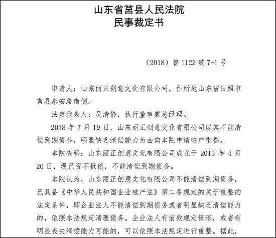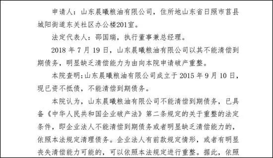 根據(jù)全國企業(yè)破產(chǎn)重整信息網(wǎng)發(fā)布的裁定書顯示,2018年7月20日,山東省莒縣人民法院下達(dá)了《民事裁定書(2018)魯1122破申2號》。這份文書表明,“2018年7月16日,山東晨曦集團(tuán)有限公司以其不能清償?shù)狡趥鶆?wù),明顯缺乏清償能力為由向本院申請破產(chǎn)重整。”