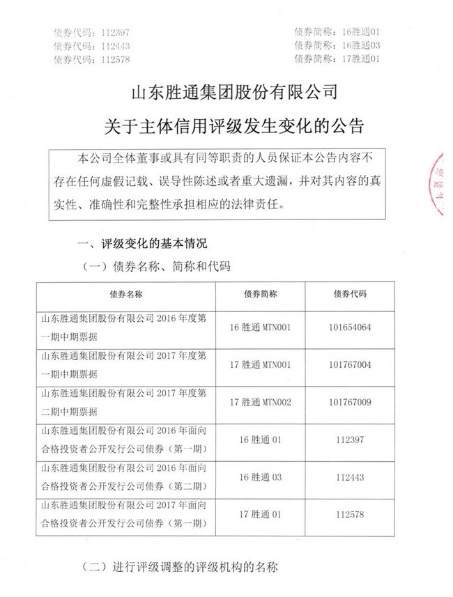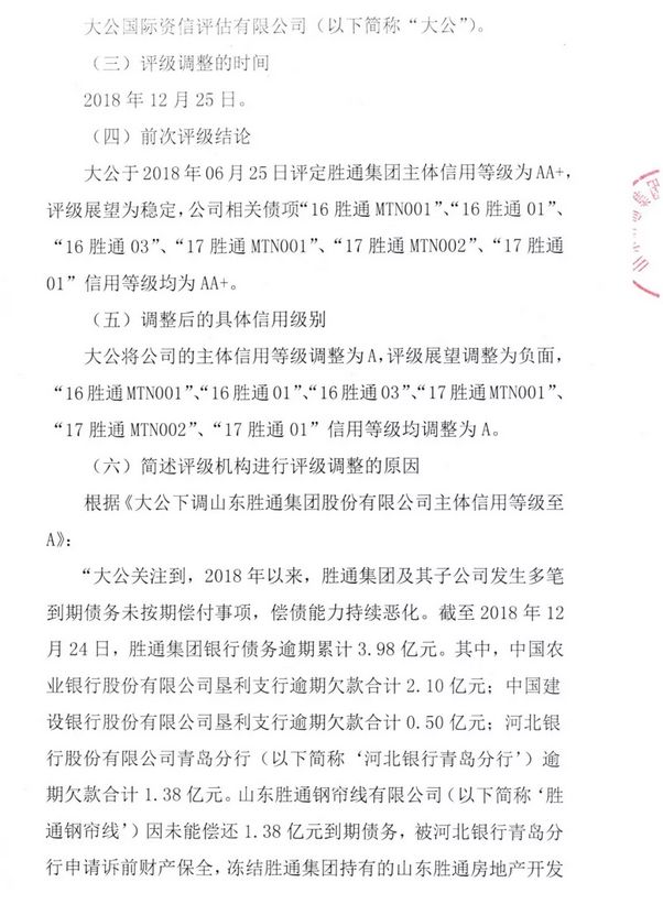 10月26日,中國企業(yè)500強(qiáng)的山東知名民企——山東勝通集團(tuán)有限公司的主體評級直接被調(diào)低4個等級,由AA+調(diào)整至A,評級展望為負(fù)面。