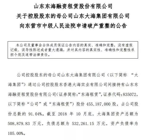 11月29日消息,新三板掛牌公司東海租賃(835072)的控股母公司山東大海集團(tuán)有限公司昨日申請破產(chǎn)重整,截至2018年10月底,大海集團(tuán)共負(fù)債53億元。