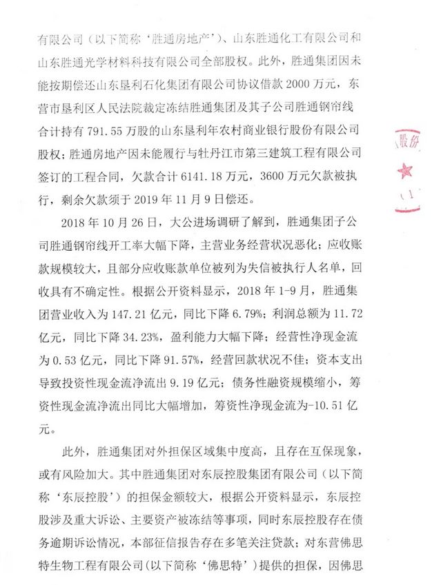 截至12月24日,勝通集團(tuán)銀行債務(wù)逾期累計3.98億元。其中,農(nóng)行墾利支行逾期欠款合計2.1億元;建行墾利支行逾期欠款合計0.5億元;河北銀行青島分行逾期欠款合計1.38億元。