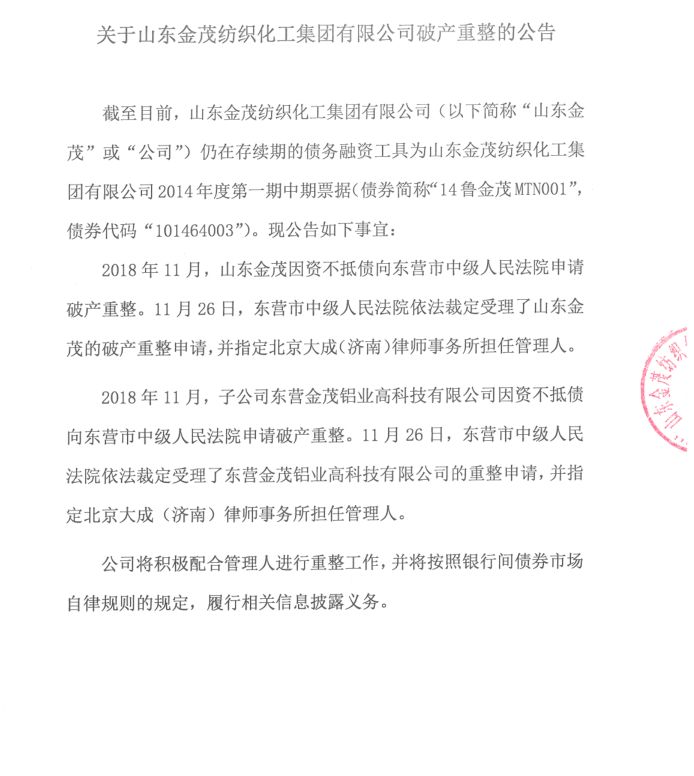 財通證券發(fā)布的受托管理事務(wù)報告同時披露,山東金茂已向山東省東營市中級人民法院申請重整。山東省東營市中級人民法院于2018年11月26日裁定受理山東金茂的重整申請。