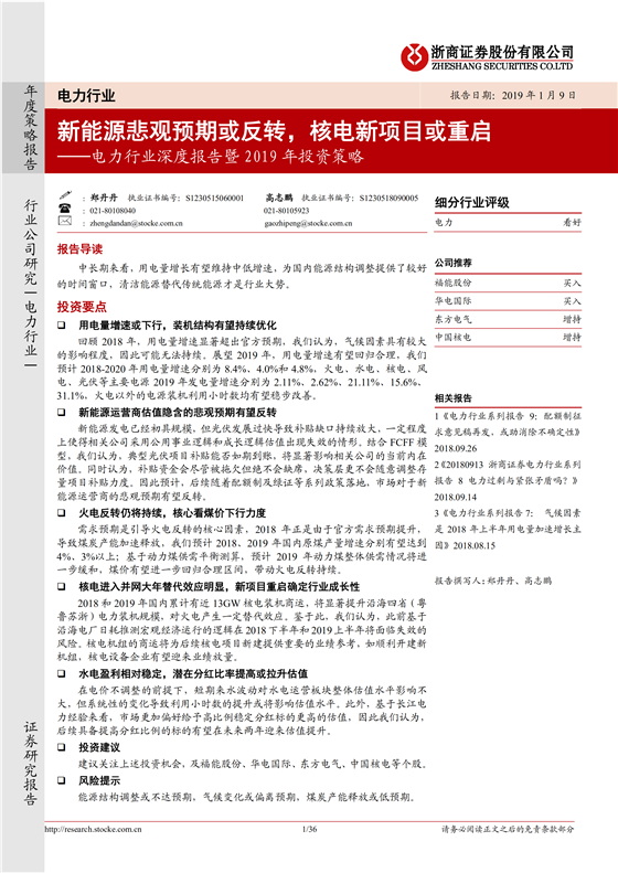 電力行業(yè)深度報(bào)告暨2019年投資策略