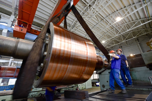 河南洛陽,中信重工機加車間內(nèi),工人正在加工轉(zhuǎn)子支架