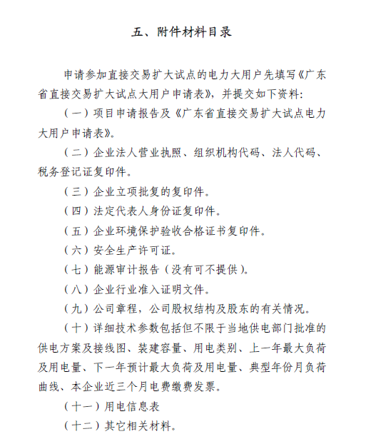 根據(jù)《廣東省經(jīng)濟(jì)和信息化委 廣東省發(fā)展改革委 國家能源局南方監(jiān)管局關(guān)于2017年電力用戶參與市場交易相關(guān)事項的通知》(粵經(jīng)信電力函〔2016〕292號)要求,2017年工商業(yè)電力大用戶參與電力市場直接交易的條件分別是年用電量8000萬、5000萬千瓦時及以上。符合條件的電力大用戶可按照附件1要求提交申報材料一式六份至我委電力資源處,我委初審后報省經(jīng)信委核準(zhǔn)。