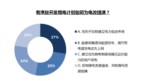 我們看到,有22%的網(wǎng)友認為,控制煤電發(fā)展速度、抑制煤電發(fā)展規(guī)模是有序放開發(fā)用電計劃的關(guān)鍵;幾乎同比例受訪人群認為,有序放開發(fā)用電計劃為電改提速的關(guān)鍵在于能夠保障清潔能源發(fā)電、調(diào)節(jié)型電源發(fā)電優(yōu)先上網(wǎng)(25%)和建立優(yōu)先購電制度保障無議價能力的用戶用電(24%),;另外27%的網(wǎng)友則認為,加快建立電力現(xiàn)貨市場將成為電力體制改革新的加速器。