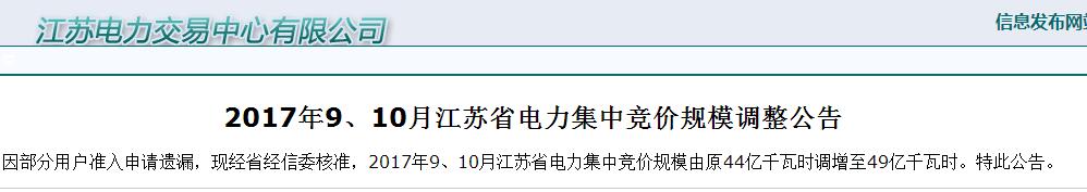 2017年9、10月江蘇省電力集中競價規(guī)模調(diào)整公告