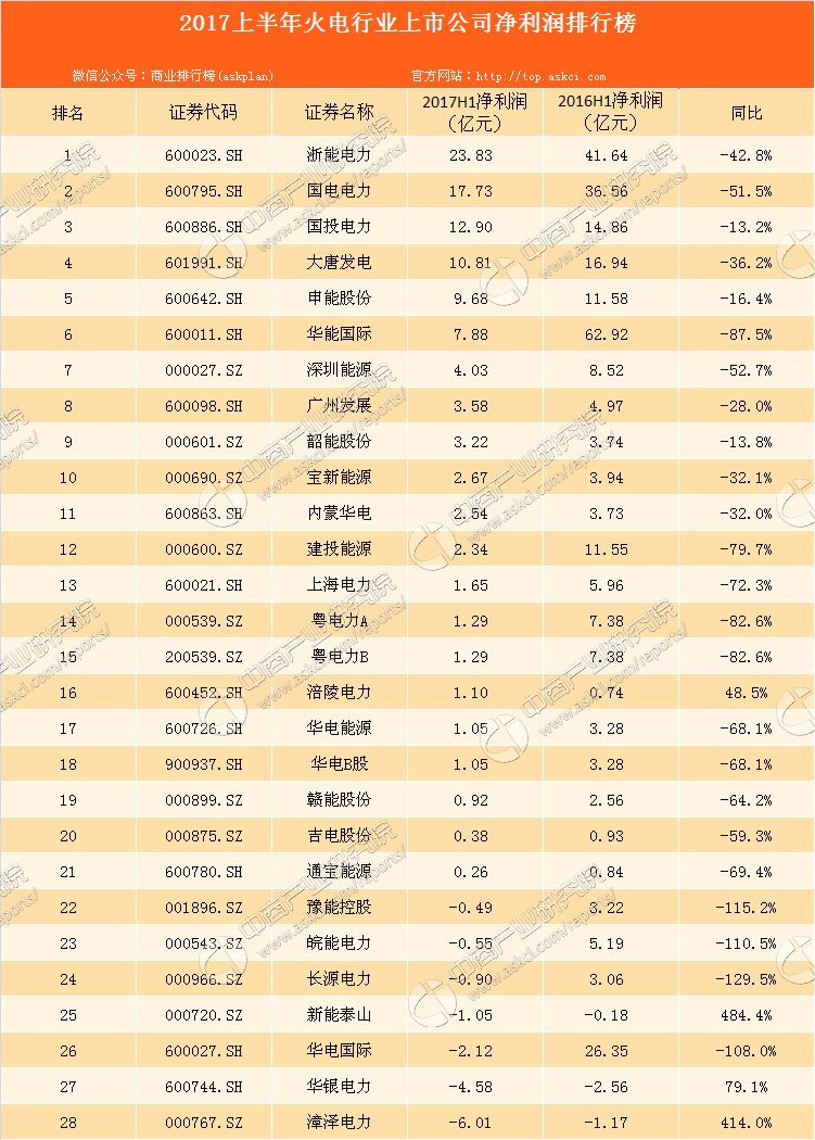 2017上半年火電行業(yè)上市公司凈利潤(rùn)排行榜