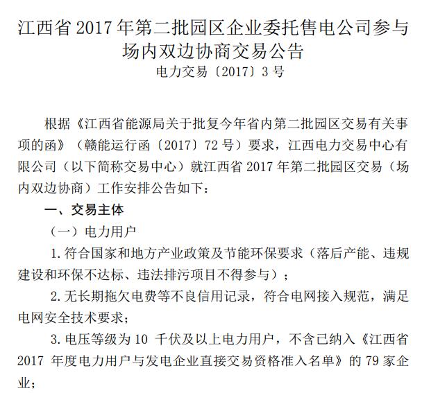 江西省將開展2017年第二批園區(qū)企業(yè)委托售電公司參與場內(nèi)雙邊協(xié)商交易