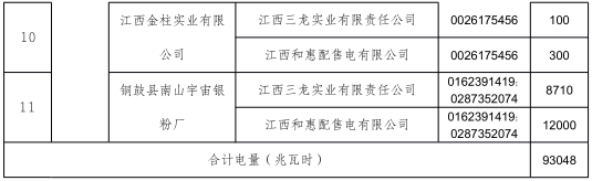 這11家電力用戶為:江西銅材有限公司、貴溪正發(fā)銅業(yè)有限公司、貴溪華泰銅業(yè)有限公司、貴溪凌云銅業(yè)有限公司、貴溪博遠(yuǎn)金屬有限公司、江西正一不銹鋼有限公司、江西銅鼓江橋竹木業(yè)有限責(zé)任公司、江西省銅鼓縣二源化工有限責(zé)任公司、江西省銅鼓縣二源化工有限責(zé)任公司、江西省銅鼓縣永寧化工有限責(zé)任公司、江西金柱實(shí)業(yè)有限公司、銅鼓縣南山宇宙銀粉廠。這11家電力用戶的合計(jì)電量為93048兆瓦時(shí)。
