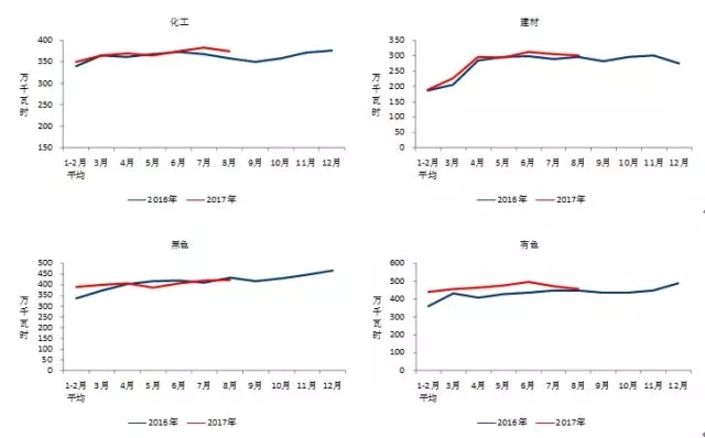 8月份,四大高載能行業(yè)用電量合計1552億千瓦時,同比增長1.8%,增速比上年同期提高1.4個百分點,占全社會用電量的比重為25.9%。其中,化工行業(yè)用電量375億千瓦時,同比增長6.3%,增速比上年同期提高9.2個百分點;建材行業(yè)用電量301億千瓦時,同比增長2.2%,增速比上年同期回落1.6個百分點;黑色金屬行業(yè)用電量421億千瓦時,同比下降2.3%,增速比上年同期回落0.7個百分點;有色金屬冶煉行業(yè)455億千瓦時,同比增長1.8%,增速比上年同期回落1.1個百分點。