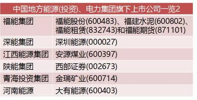 皖能集團旗下上市公司為皖能電力(000543),浙能集團擁有2家上市公司,分別為浙能電力(600023)和寧波海運(600798),湖北能源集團擁有1家上市公司,為湖北能源(000883),福能集團擁有4家上市公司,分別為福能股份(600483)、福建水泥(600802)、福能租賃(832743)和福能期貨(871101),深能集團擁有1家上市公司,為深圳能源(000027),江西省能源集團擁有1家上市公司,為安源煤業(yè)(600397),陜能集團是西部證券(002673)的實際控制人,青海省投資集團旗下上市公司有金瑞礦業(yè)(600714),河南能源旗下的上市公司有1家,為大有能源(600403)。