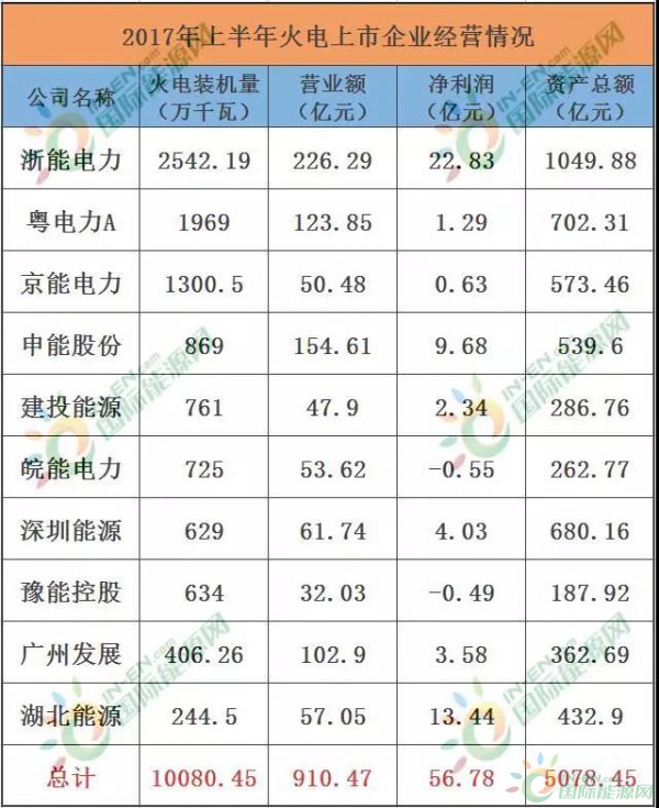 2017年上半年,除五大四小外,十家最大的火電上市公司的裝機(jī)總量占到了全國總裝機(jī)的10.6%。下面是火電領(lǐng)域前十位企業(yè)的裝機(jī)量與運(yùn)營情況:
