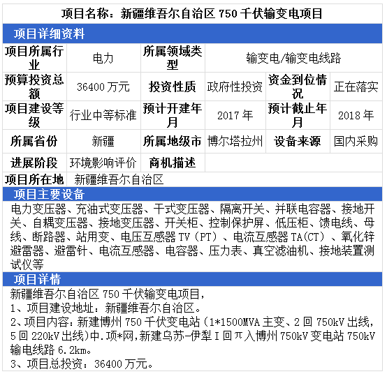 新疆維吾爾自治區(qū)750KV輸變電項(xiàng)目、湖北省咸寧市風(fēng)電項(xiàng)目、內(nèi)蒙古自治區(qū)鄂爾多斯市110kV變電站擴(kuò)建2號(hào)主變輸變電項(xiàng)目,最高項(xiàng)目總投資達(dá)55089萬元。項(xiàng)目主要設(shè)備有:電力變壓器、充油式變壓器、干式變壓器、隔離