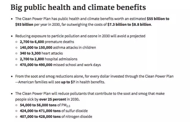 奧巴馬政府時(shí)期的美國(guó)環(huán)保局稱,《清潔電力計(jì)劃》減少的顆粒物污染和臭氧污染可以防止15萬例兒童哮喘和6600例過早死亡。