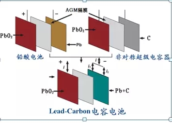 與常規(guī)鉛酸電池相比,鉛碳電池將具有雙電層電容特性的炭材料(C)與海綿鉛(Pb)負(fù)極進(jìn)行合并制作成既有電容特性又有電池特性的鉛碳雙功能復(fù)合電極,鉛碳復(fù)合電極再與PbO2正極匹配組裝成鉛碳電池。鉛碳電池是一種混合型儲(chǔ)能元件,由兩部分組成,包括鉛酸電池部分和非對(duì)稱型超級(jí)電容器部分,兩者以內(nèi)部無(wú)控制電路方式并聯(lián)而成。