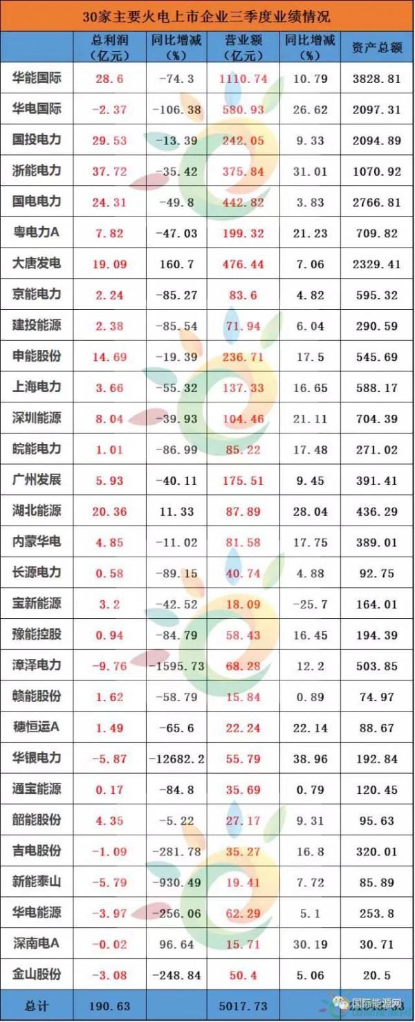 30家火電上市公司的利潤總額為190.63億元,其中有8家企業(yè)出現(xiàn)虧損,虧損額度最大的漳澤電力前三季度虧損了9.76億元。在利潤同比增長方面,只有大唐發(fā)電和深南電A為正增長,其他28家凈利潤都處于負(fù)增長狀態(tài),其中利潤降幅最大的為華銀電力,降幅達(dá)到12682.2%,虧損5.87億元;其次為漳澤電力,降幅達(dá)到1595.73%。30家上市公司中,利潤降幅超過100%的企業(yè)達(dá)到8家,形勢不容樂觀。