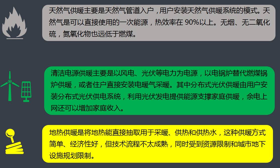 供暖季溫暖和藍(lán)天如何兼得?清潔能源供暖成為打破能源與環(huán)境困局的重要手段。目前清潔能源供暖主要包括天然氣供暖、電力供暖、地?zé)峁┡确绞?,其中電力供暖可以?yīng)用光伏、風(fēng)電等可再生能源提供電力。