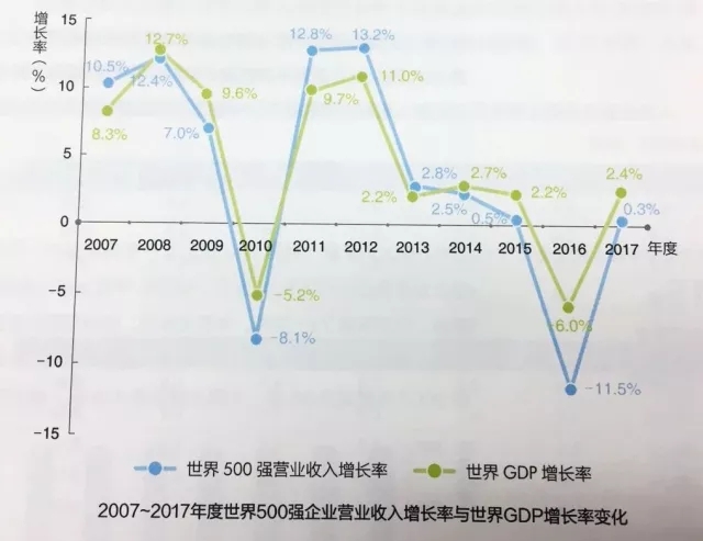 從總量上看,2007-2017十年間,世界500強(qiáng)企業(yè)營業(yè)收入總額從21萬億美元增長到28萬億美元,與世界GDP總額的比值始終穩(wěn)定在40%左右。