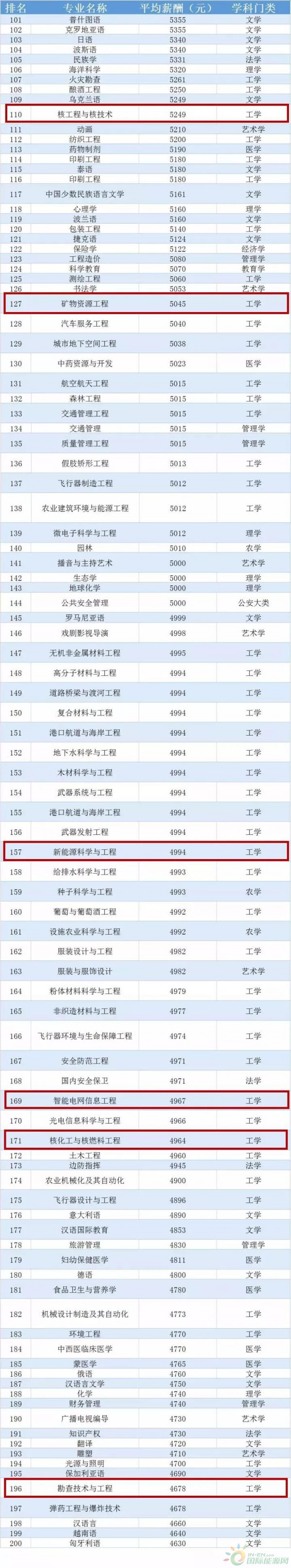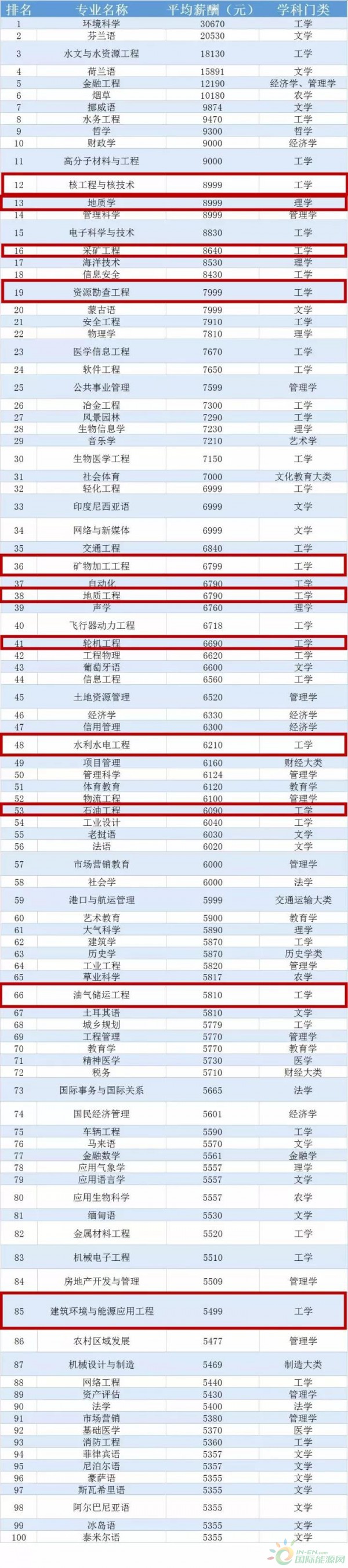 這份榜單里,能源領(lǐng)域拔得頭籌的是最“高大上”的核工程與核技術(shù)專(zhuān)業(yè),排名12,工資高達(dá)8999元;令人意外的是,一向被認(rèn)為“最苦最累”的地質(zhì)學(xué)、采礦工程、資源勘查工程,竟然排位頗高,分別為13、16、19,平均工資也達(dá)到了8999、8640和7999元。