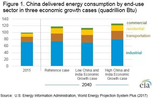 EIA現(xiàn)在預(yù)測中國2040年能源消費(fèi)量,將在2015年133千萬億BTU基礎(chǔ)上,增長到173千萬億BTU,年增長率為30%。奇怪的是,EIA對中國經(jīng)濟(jì)增長率的預(yù)測用的是1990年時預(yù)測的數(shù)據(jù)。2015年-2040年中國經(jīng)濟(jì)平均增長率為4.2%。居民能源消費(fèi)量(能源消費(fèi)增長最快的部分)每年增長2.2%。