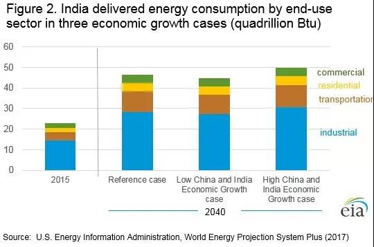 目前,印度的能源消費(fèi)總量趕不上中國:2015年能源消費(fèi)28千萬億BTU。然而EIA預(yù)測印度到2040年能源消費(fèi)增速將超過100%,達(dá)到61千萬億BTU。2025年印度的人口將超過中國。雖然印度人均收入也將快速增加,但能源消費(fèi)不及中國的一半。