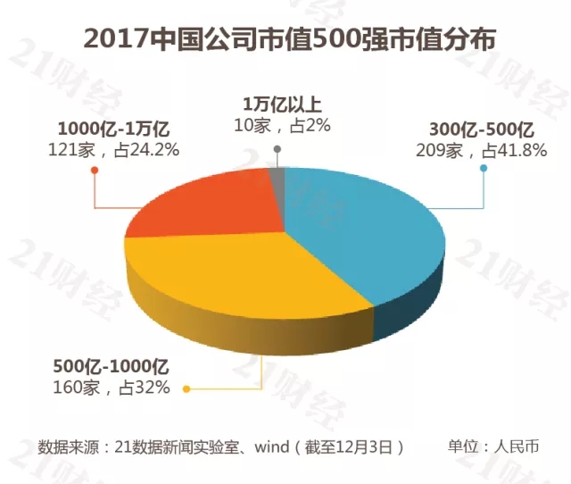 21數(shù)據(jù)新聞實驗室選擇在上海、深圳、香港、紐約等全球15個交易所上市的所有中國公司,對它們的最新市值進(jìn)行加總換匯計算,得出“2017中國上市公司市值500強榜單”。