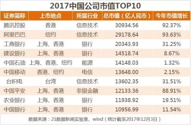 截至2017年12月1日,占據(jù)500強前兩位的騰訊控股、阿里巴巴總市值分別為30935億、29179億,差不多高出第三名工商銀行50%。