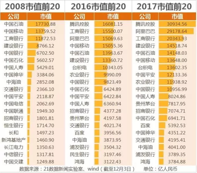 值得一提的是,這也是十年來首次,互聯(lián)網(wǎng)科技公司包攬前兩名。而在2008年至2014年,中國石油一直雄踞市值榜首,占據(jù)第二名的基本是工商銀行;2015年則由工商銀行、中國移動領(lǐng)先。