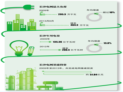 2009年至2013年,長沙共完成電網(wǎng)基建投資約51.84億元,完成武廣高鐵專變、楚溈、延農(nóng)、浦沅、余家灣、月塘等一批220千伏變電站建設(shè);110千伏及35千伏輸變電工程共有71個項(xiàng)目投產(chǎn),新增變電容量228.17萬千伏安,新增線路357.7公里;城市配電網(wǎng)共完成377個項(xiàng)目,新建10千伏電纜線路551.5公里,架空線路235.4公里,新增變壓器474臺。