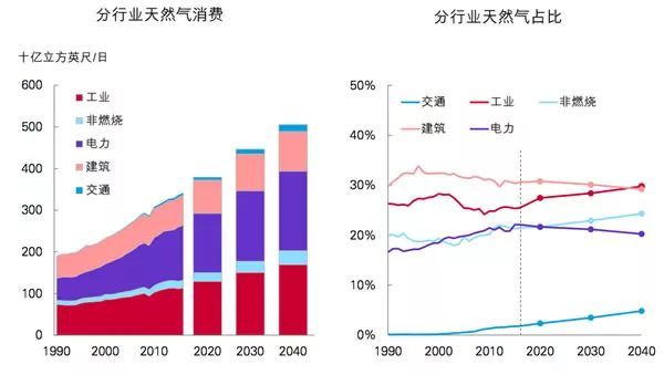 ◆交通領(lǐng)域天然氣需求增長最快,因為天然氣越來越多地被用于卡車運輸和海運。雖然交通行業(yè)需求增長的絕對值很小(110億立方英尺/日),可交通行業(yè)內(nèi)的天然氣占比到2040年將增加到近5%。