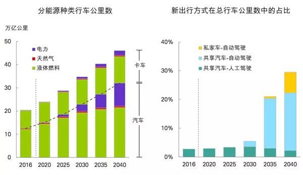 ◆在漸進轉(zhuǎn)型情景下,到2040年乘用車行車公里數(shù)將有30%是使用的電力,顯著高于電動車(純電和混電)全球汽車總量中的的占比15%。這一更高的比例意味著在共享出行中電動汽車將占據(jù)重要地位。在共享出行領(lǐng)域汽車的使用強度更大而電動汽車每公里成本更低,因此比內(nèi)燃機汽車更有競爭力。尤其是2020年左右將實現(xiàn)的全自動駕駛,會使汽車行駛成本快速下降導(dǎo)致共享出行(和電動汽車的使用)在2030年得到大幅上升。