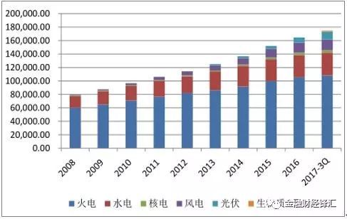 截止到2017年三季度末,我國煤電裝機(jī)10.81億千瓦,水電3.39億千瓦,核電3582萬千瓦,風(fēng)電1.57億千瓦,光伏1.2億千瓦,生物質(zhì)1423萬千瓦;火電裝機(jī)占全部裝機(jī)容量的61.87%,水電裝機(jī)占19.4%,核電占2.05%,風(fēng)電占9.0%,光伏占6.87%,生物質(zhì)占0.81%。從發(fā)電量來看,2017年前三季度,我國煤電發(fā)電3.45萬億度,水電8147億度,核電1834億度,風(fēng)電2128億度,光伏857億度,生物質(zhì)568億度。煤電發(fā)電量占比高達(dá)71.84%,水電占16.95%,核電占3.82%,風(fēng)電占4.43%,光伏占1.78%,生物質(zhì)占1.18%。