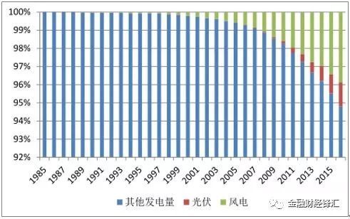 2016年,全球風(fēng)電發(fā)電量在總發(fā)電量中的占比為3.87%,光伏占比為1.34%,二者合計(jì)僅為5.2%。但風(fēng)電和光伏由于擁有清潔環(huán)保的優(yōu)勢,以及較大的成本下降潛力,未來的發(fā)展空間不可限量。