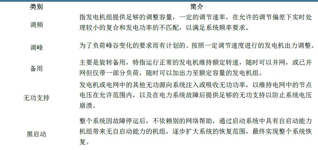 電力市場(chǎng)輔助服務(wù)是指為維護(hù)電力系統(tǒng)的安全穩(wěn)定運(yùn)行,保證電能質(zhì)量,除正常電能生產(chǎn)、輸送、使用外,由發(fā)電企業(yè)、電網(wǎng)經(jīng)營(yíng)企業(yè)和電力用戶提供的服務(wù)。其主要內(nèi)容包括:一次調(diào)頻、自動(dòng)發(fā)電控制(AGC)、調(diào)峰、無(wú)功調(diào)節(jié)、備用、黑啟動(dòng)等。其中,發(fā)電機(jī)組的一次調(diào)頻、設(shè)計(jì)功率因素范圍內(nèi)的無(wú)功調(diào)整和機(jī)組設(shè)計(jì)調(diào)峰率以內(nèi)的調(diào)峰屬于無(wú)償且必備的基本輔助服務(wù)。而有償輔助服務(wù)指除基本輔助服務(wù)之外的其他輔助服務(wù),包括AGC、備用、無(wú)功服務(wù)和黑啟動(dòng)等。