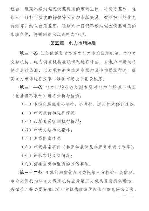 最后一個(gè)比較明顯的是對(duì)市場(chǎng)主體繳納偏差考核費(fèi)用的時(shí)間節(jié)點(diǎn)設(shè)立了緩沖期,也明確了逾期三十天拒不整改的就暫停市場(chǎng)交易,不按市場(chǎng)化電價(jià)結(jié)算;逾期六十天的強(qiáng)制退出江蘇電力市場(chǎng),可以說(shuō)處罰條件和手段更明確了。