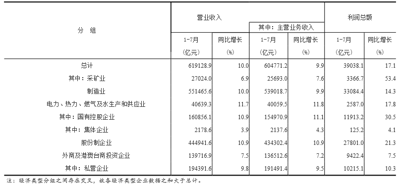 1-7月份,全國規(guī)模以上工業(yè)企業(yè)實現(xiàn)利潤總額39038 1億元,同比增長17 1%(按可比口徑計算,考慮統(tǒng)計制度規(guī)定的口徑調(diào)整、統(tǒng)計執(zhí)法增強(qiáng)、剔除重復(fù)數(shù)據(jù)、企業(yè)改革剝離等因素影響,詳見附注二),增速比1-6月份放緩0 1個百分點。
