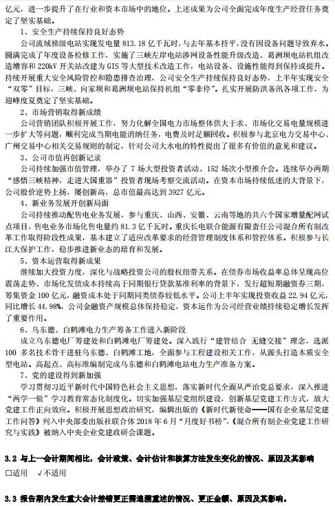 日前,中國長江電力股份有限公司發(fā)布2018 年半年度報告:上半年,面對電力消納形勢嚴峻,資本市場走勢低迷等多重不利因素,公司上下深入學習貫徹習近平總書記考察三峽工程重要講話精神,狠抓安全生產,努力發(fā)揮梯級調度效益,梯級電站累計發(fā)電 813.18 億千瓦時,安全生產保持了良好態(tài)勢,利潤總額首次突破百億大關,達 102.16 億元,同比增長 5.09%,首次突破百億元大關,創(chuàng)歷史最好水平;公司市值創(chuàng)歷史新高超過 3900 億元,進一步提升了在行業(yè)和資本市場中的地位。上述成果為公司全面完成年度生產經營任務奠定了堅實基礎。
