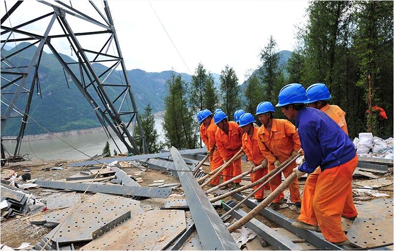【背景】 在酒湖±800千伏特高壓湖北恩施州巴東段,北京送變電公司員工正在長江北岸組立跨江5535號鐵塔?! 【坪?amp;plusmn;800