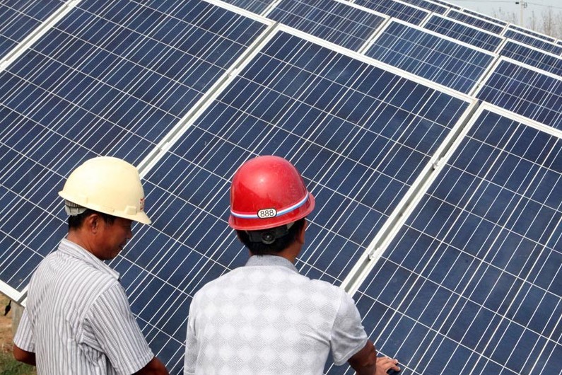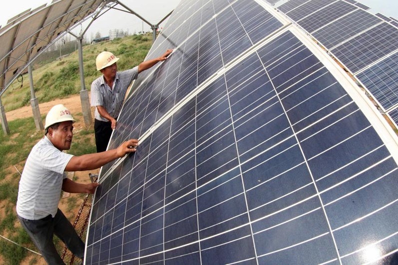 8月28日,工作人員在江蘇省贛榆縣第一座光伏電站工地加緊施工。