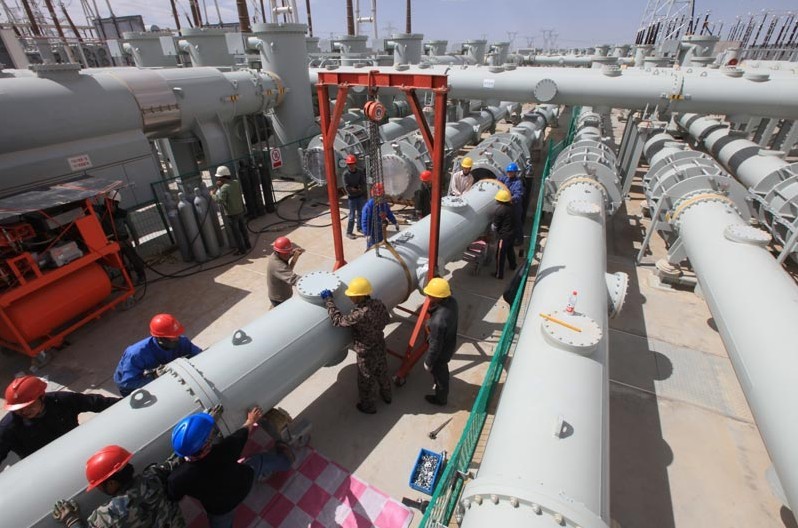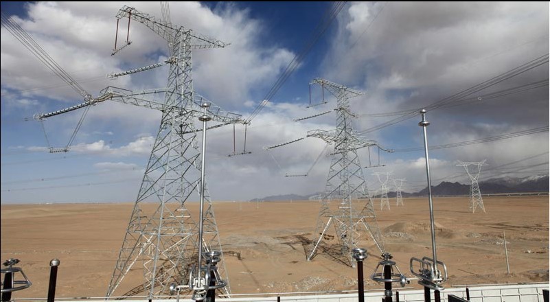 5月8日我們起了一個大早,早早地吃完早餐,拿起各自的采訪行頭,戴著安全帽,跟隨宋新民等人一同來到產(chǎn)品安裝現(xiàn)場進(jìn)行實地采訪。走進(jìn)施工現(xiàn)場,高高的線塔直插云霄,公司生產(chǎn)的6個間隔800千伏全封閉組合電器就像6個巨型方陣,整齊威武地屹立戈壁灘中等待著檢閱。