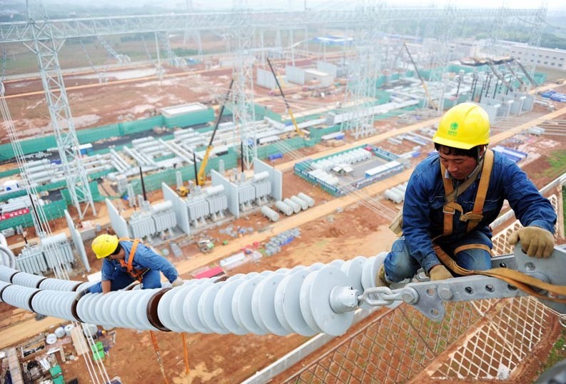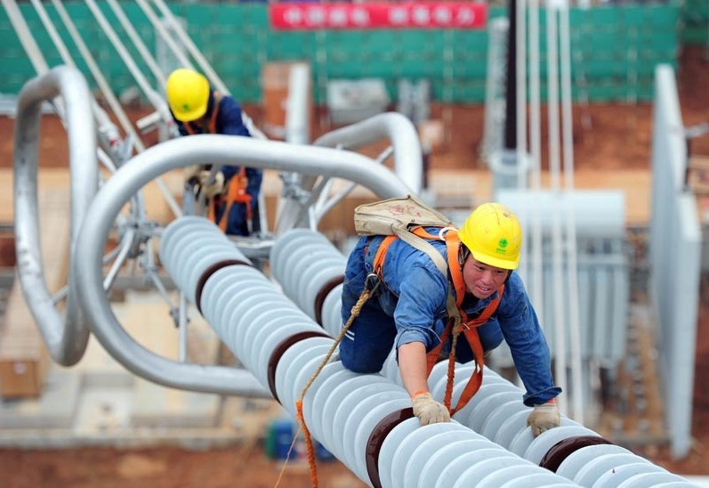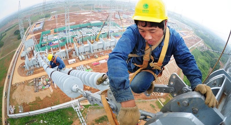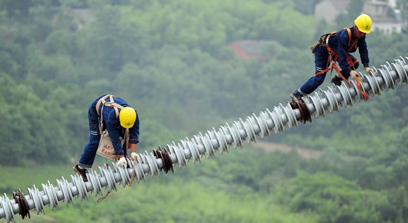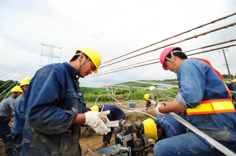 6月9日,在安徽省蕪湖縣紅楊鎮(zhèn)境內(nèi),安徽送變電工程公司施工人員在80多米高空作業(yè)。當(dāng)日,由安徽送變電工程公司承建的皖電東送1000千伏淮上線10標(biāo)段在全線路23個一般線路施工標(biāo)段中率先貫通。 該標(biāo)段線路全長