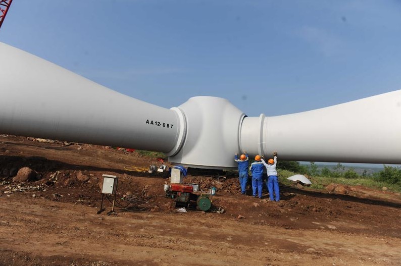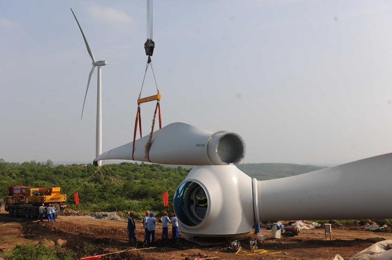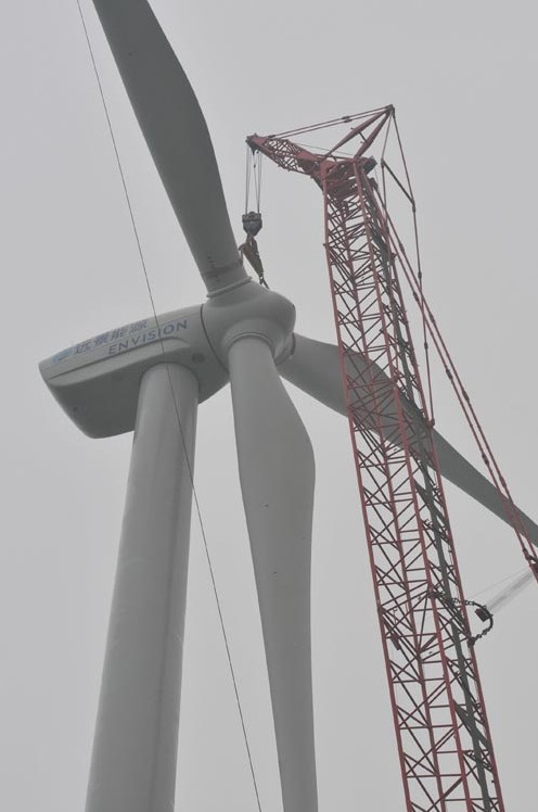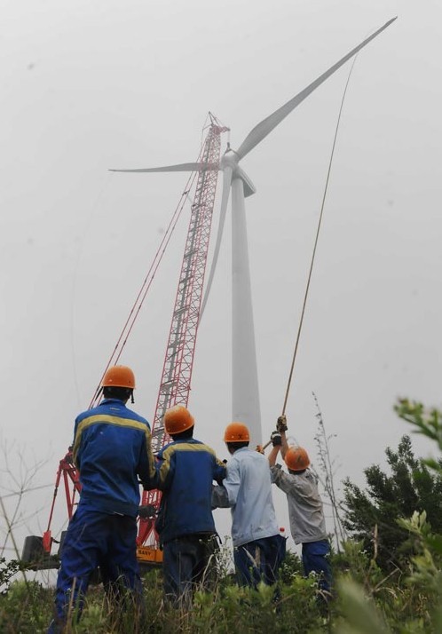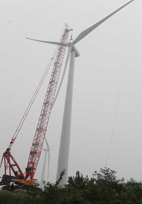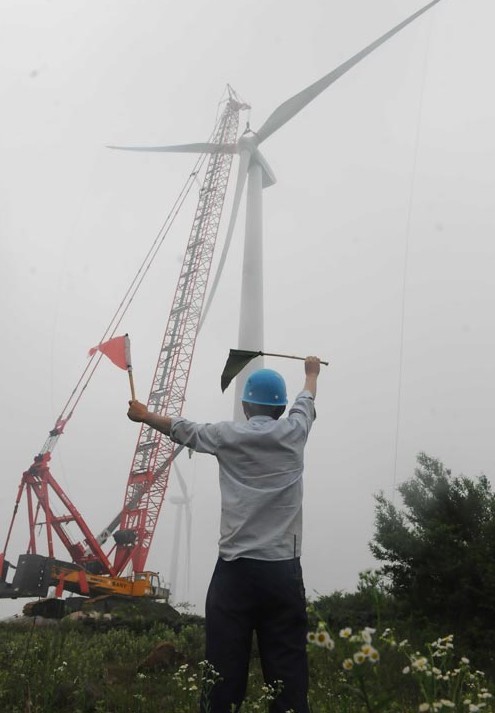 安徽省明光市首座新能源風(fēng)電場——技術(shù)人員正在指揮吊裝魯山風(fēng)力發(fā)電場的最后一臺風(fēng)機。當日,龍源電力集團股份有限公司安徽省明光市魯山49 5兆瓦風(fēng)電項目全部建成投產(chǎn)。魯山風(fēng)電項目位于江淮分水嶺丘陵山區(qū)的
