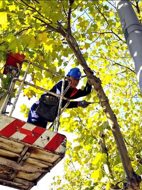 棲霞市城區(qū)供電線路共有11條,線路總長(zhǎng)110多公里,線路下面大多是美化環(huán)境的柳樹(shù)、楊樹(shù)、松樹(shù)和法國(guó)梧桐,這些樹(shù)木在園林人員的澆灌下,成長(zhǎng)迅速,有的高度達(dá)10余米,嚴(yán)重威脅著線路的健康運(yùn)行。由于高度高,直徑細(xì),人員根本無(wú)法攀登,于是他們用專用工程車,及時(shí)派專人清理這些樹(shù)木。