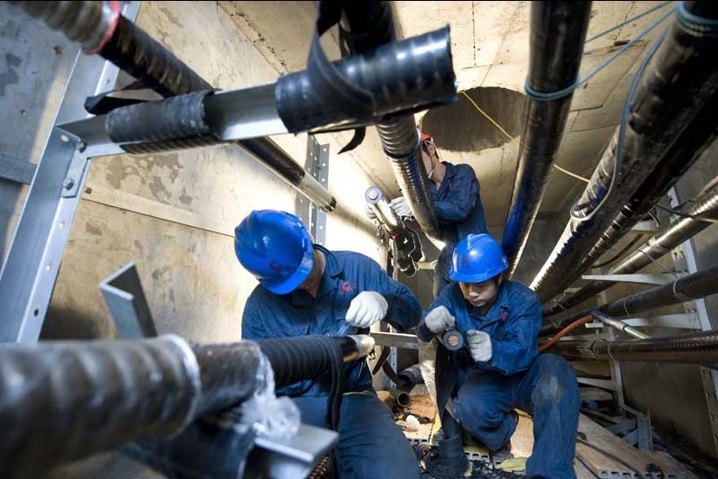 10月23日,在無錫市110千伏工運線地下電纜勾中技術(shù)人員在安裝電纜頭。連日來,無錫供電公司組織技術(shù)人員對輸變電設(shè)備進(jìn)行狀態(tài)檢修、擴容改造,消除設(shè)備缺陷,保障電網(wǎng)安全穩(wěn)定運行,確保十八大期間輸配電設(shè)備的安全穩(wěn)定運行。