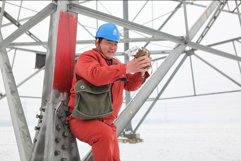 安徽地區(qū)普降大雪,阜陽(yáng)農(nóng)電公司加強(qiáng)線路巡視,保障電網(wǎng)可靠供電。圖為該公司周棚供電所員工劉德富、杜愛君對(duì)22千伏2759潁阜線路進(jìn)行特巡?! ∽髡撸和跷∥  ?/div>