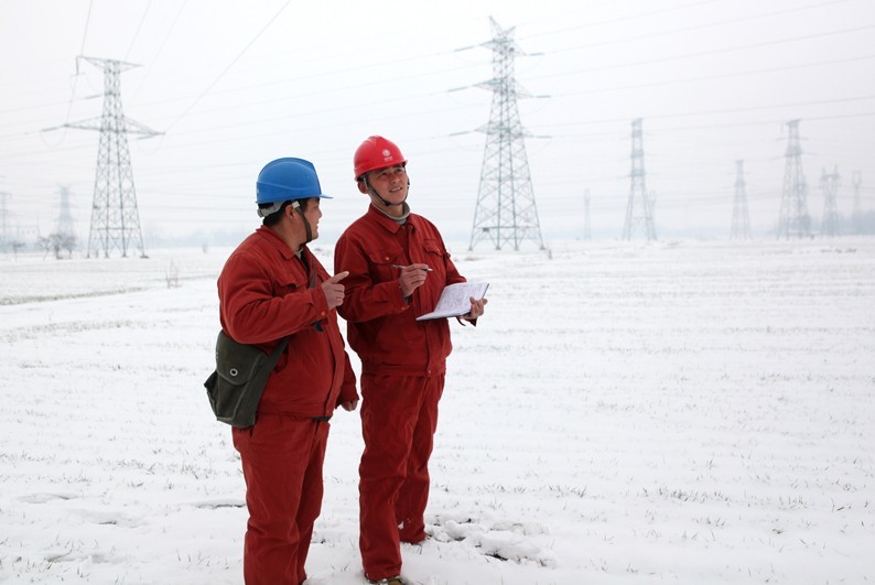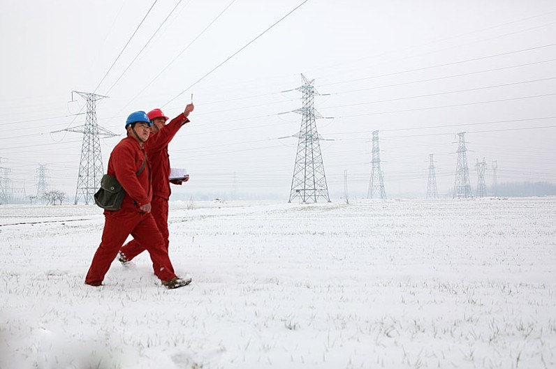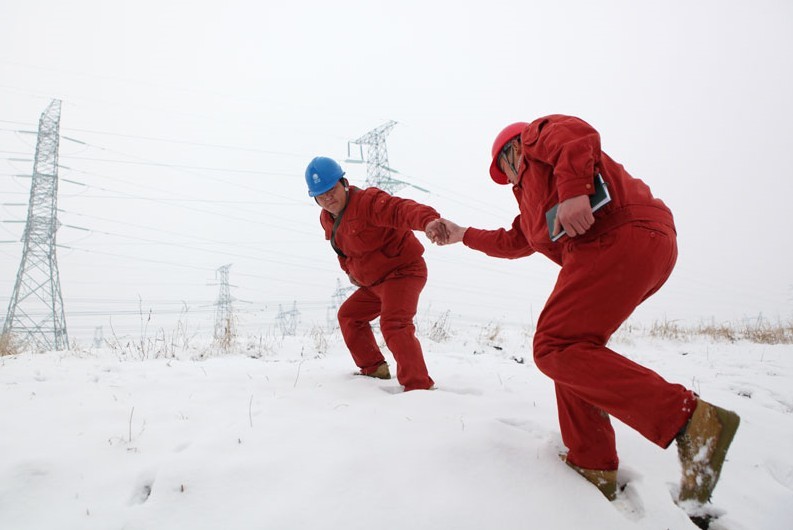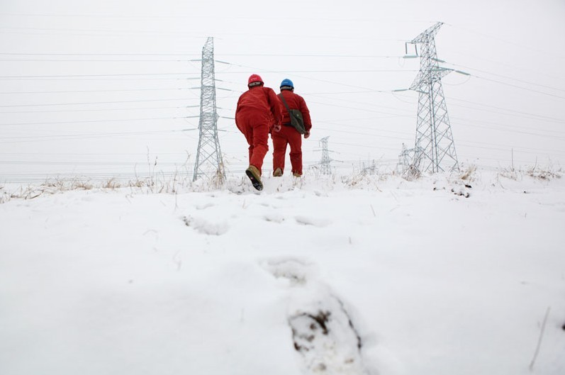 安徽地區(qū)普降大雪,阜陽(yáng)農(nóng)電公司加強(qiáng)線路巡視,保障電網(wǎng)可靠供電。圖為該公司周棚供電所員工劉德富、杜愛君對(duì)22千伏2759潁阜線路進(jìn)行特巡。