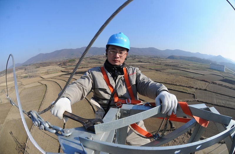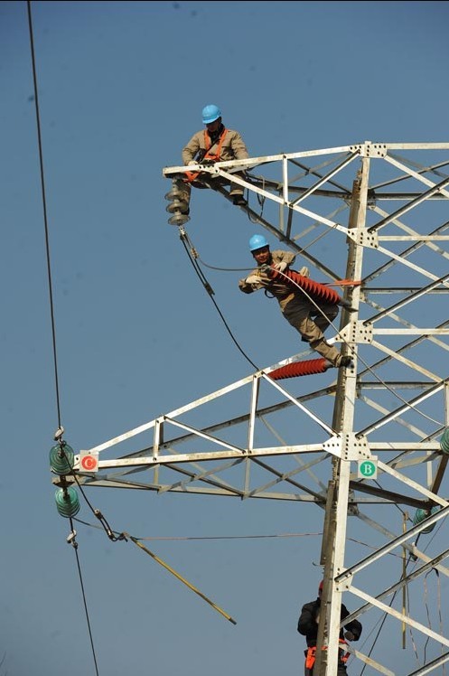 2013年1月18日,在安徽省滁州市珠龍鎮(zhèn)北關(guān)村,電力工人在高空對輸電線路進行技術(shù)改造。當日,安徽省滁州市迎來今冬用電日最高負荷128萬千瓦。面對新一輪冬季用電負荷高峰,保證電網(wǎng)安全運行,國家電網(wǎng)安徽省滁州供電公司提前制訂了巡檢重點線路和設(shè)備、開展電網(wǎng)反事故處置演練、加強電網(wǎng)運行值班和搶修力量等多項“迎峰度冬”保供電預(yù)案,并組織600余名技術(shù)人員利用晴好天氣對轄區(qū)供電設(shè)備和輸電線路進行全面檢查、維護,發(fā)現(xiàn)安全隱患及時處理,同時在全市部署極端氣候24小時故障快速搶修隊伍,確保轄區(qū)居民冬季用電安全。