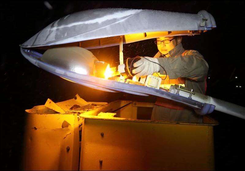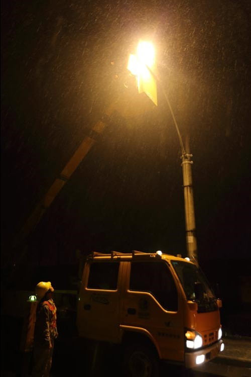 圖為諸暨市供電局搶修隊員在城市工業(yè)區(qū)冒雪檢修故障路燈。